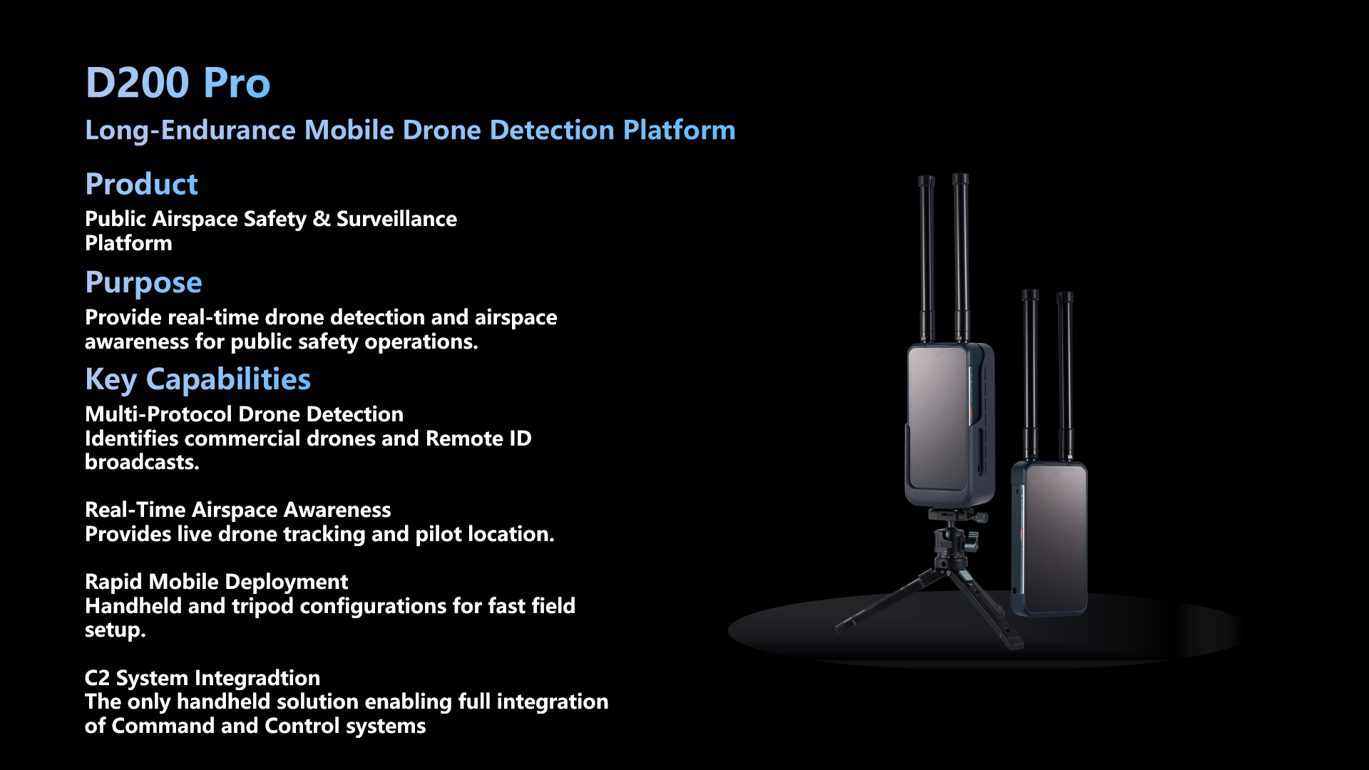 The D200 Pro is a high-performance, multi-protocol portable drone detection system designed for tactical flexibility and rapid deployment. It provides comprehensive situational awareness by identifying over 300+ popular drone models and supporting advanced flight path tracking.