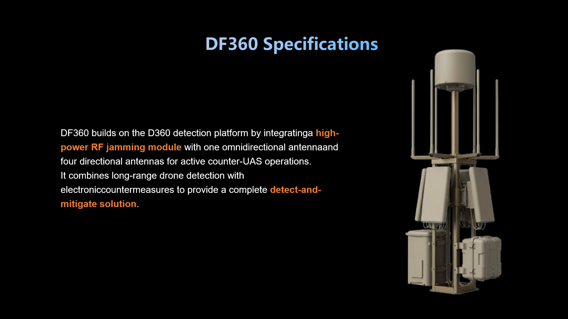The DF360 is an integrated counter-UAS (Unmanned Aerial System) platform that evolves from the D360 by adding active neutralization capabilities. It serves as a comprehensive "detect-and-mitigate" solution, combining long-range surveillance with high-power electronic countermeasures.