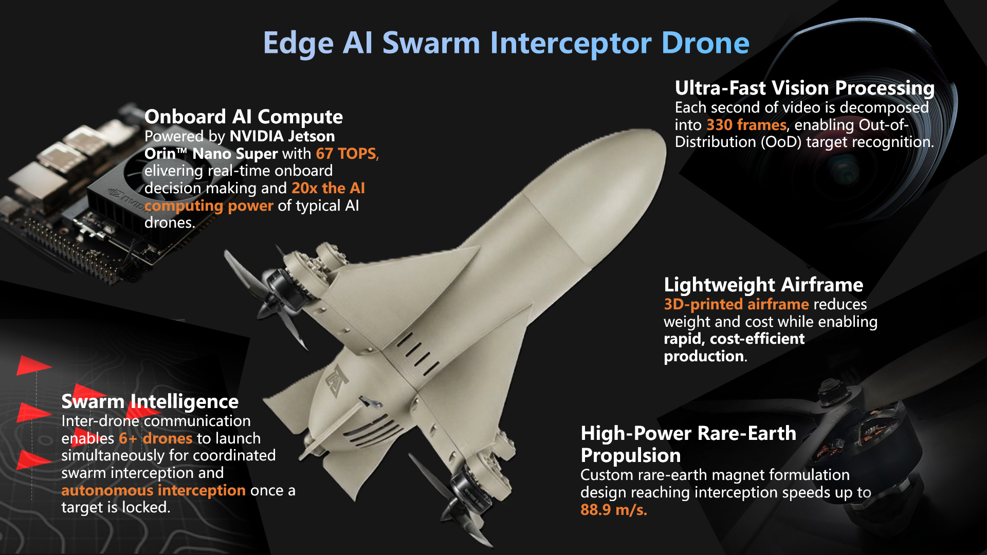 Extreme Speed: Utilizing custom rare-earth propulsion, the interceptor reaches speeds of 88.9 m/s, making it capable of catching fast-moving targets.